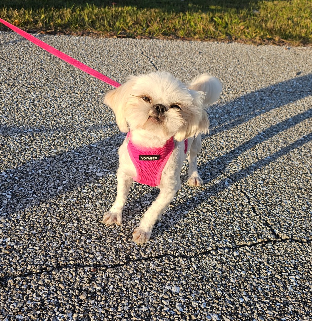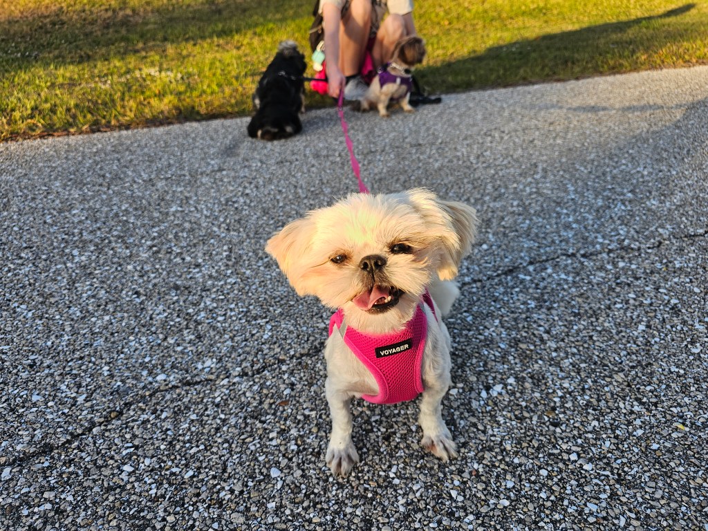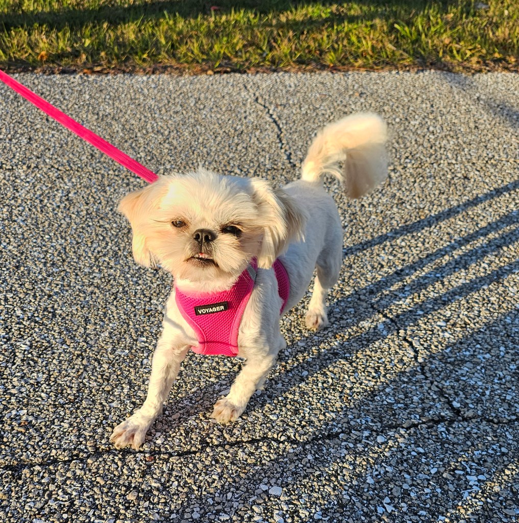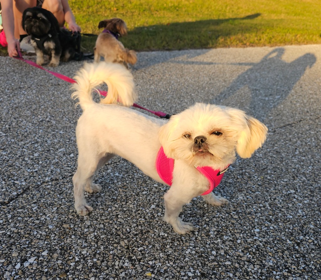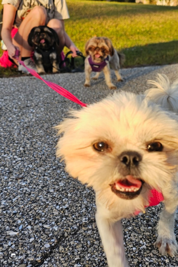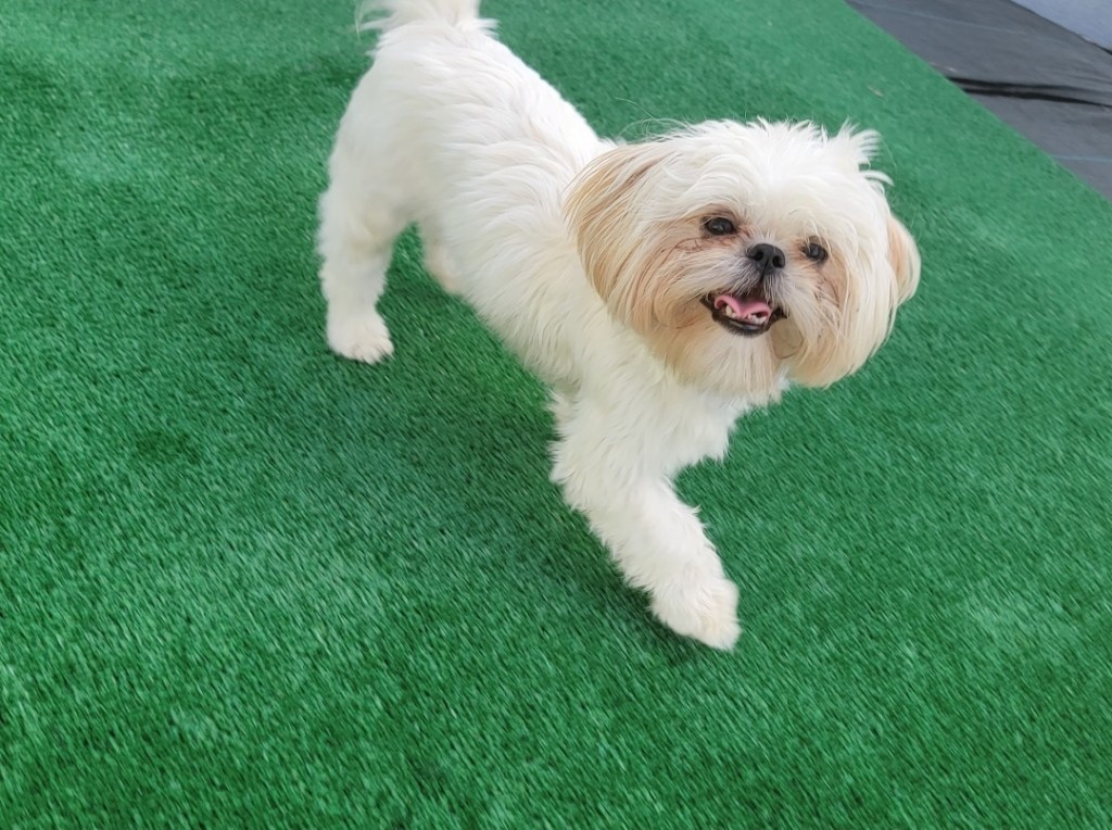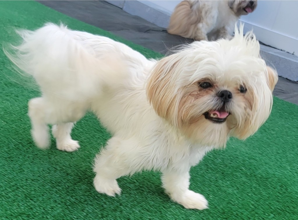 Eve is a petite, dainty little girl. Her coat is a little more cottony and more difficult to keep longer as it tangles easier. She does have other excellent attributes though. I love her jet black nose and eyes against her beautiful white cream coat. She is very healthy and agile, no signs of physical impairments at all. She can keep up with the tzu gang, running at top speeds and leaping as they go. She has a lot of fun with her dog friends.