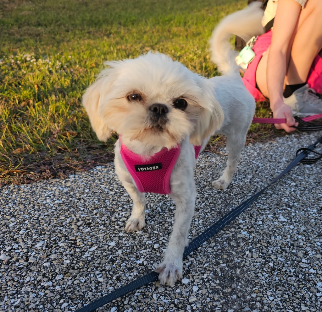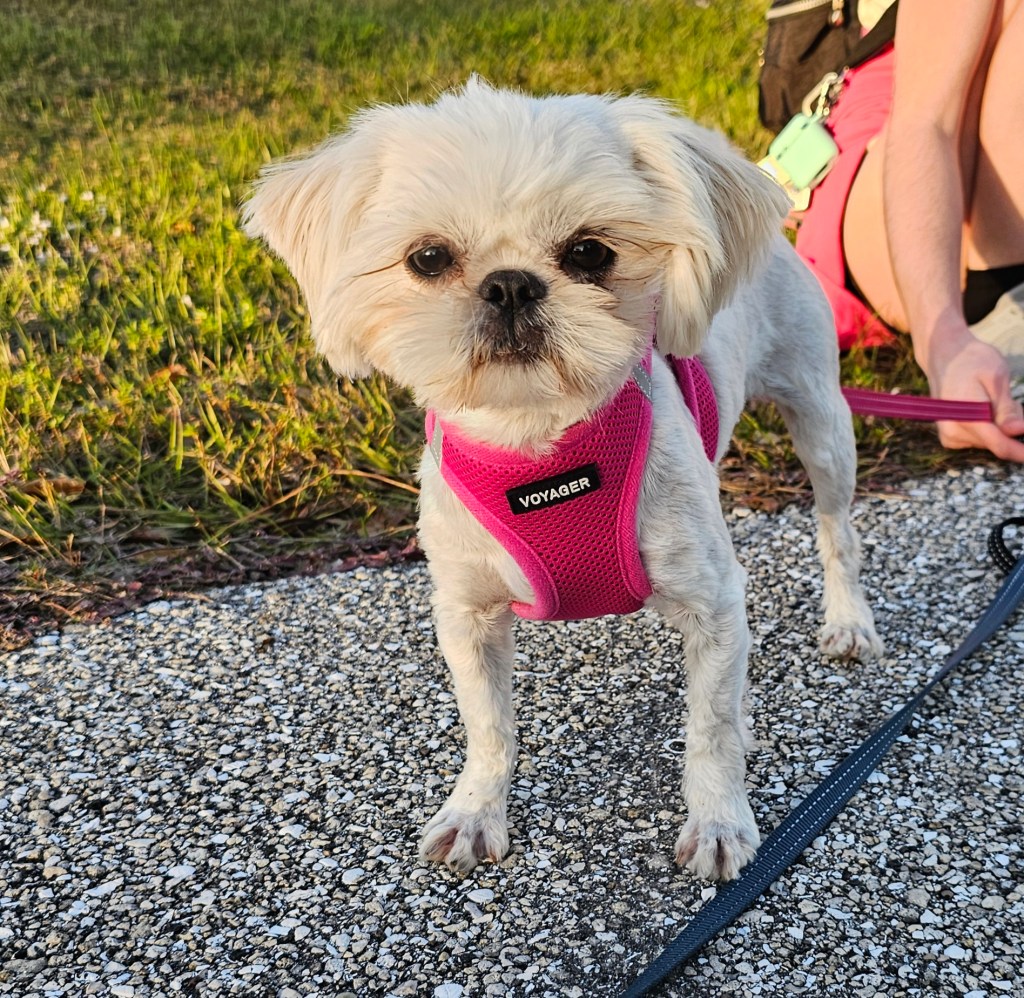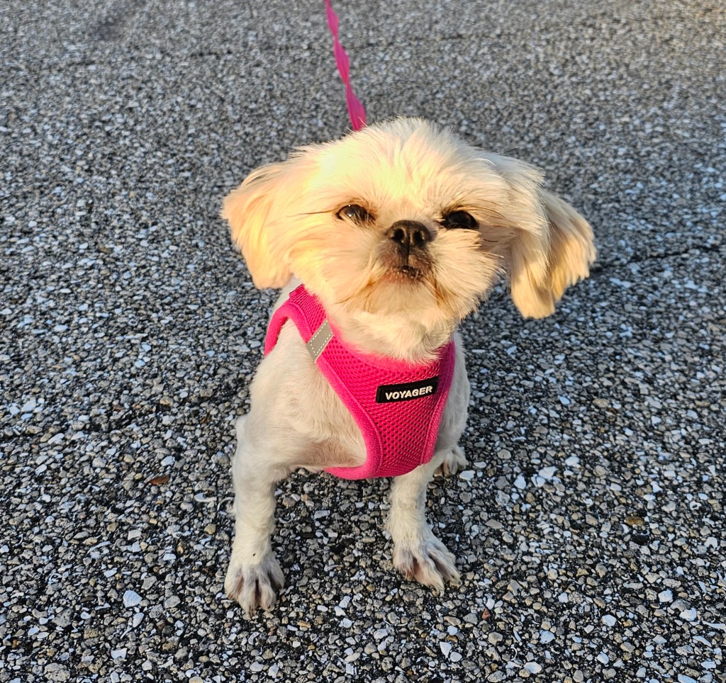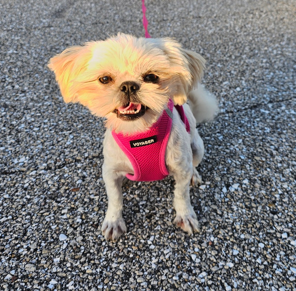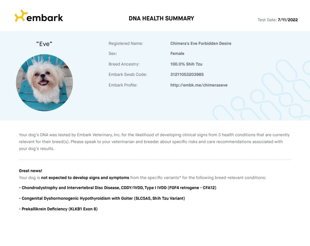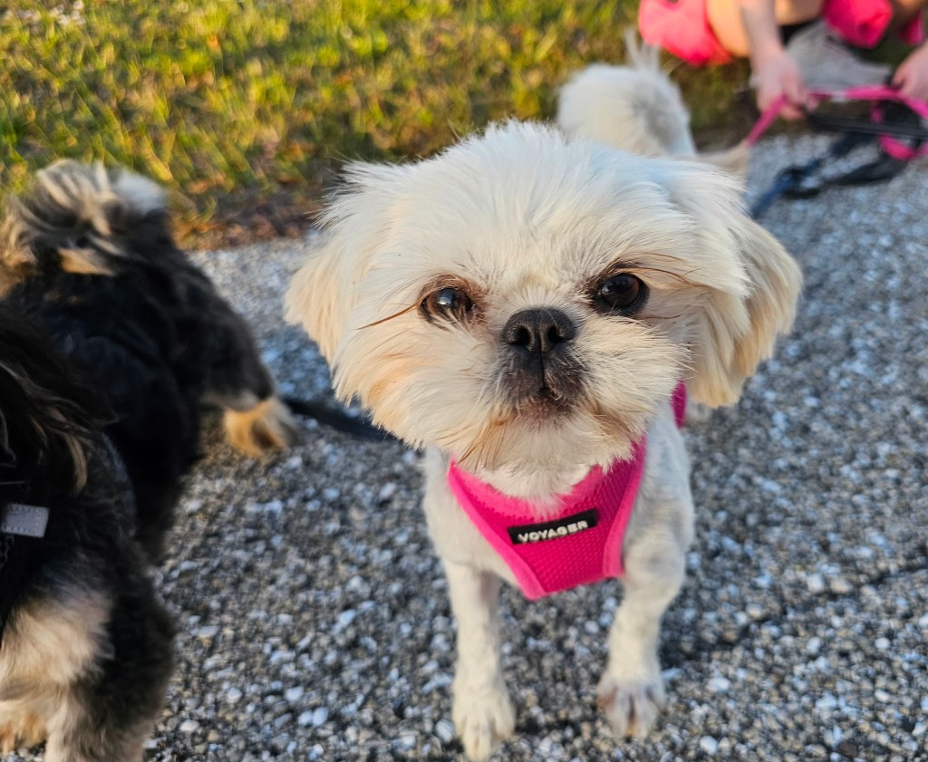 Eve is a petite, dainty little girl. Her coat is a little more cottony and more difficult to keep longer as it tangles easier. She does have other excellent attributes though. I love her jet black nose and eyes against her beautiful white cream coat. She is very healthy and agile, no signs of physical impairments at all. She can keep up with the tzu gang, running at top speeds and leaping as they go. She has a lot of fun with her dog friends.