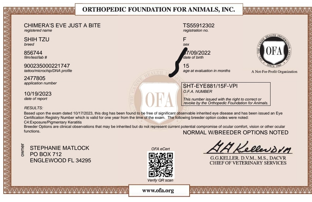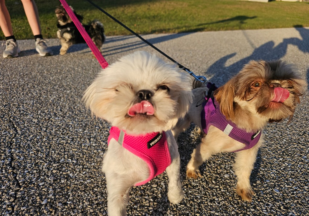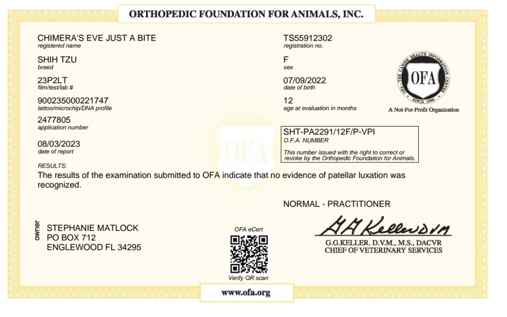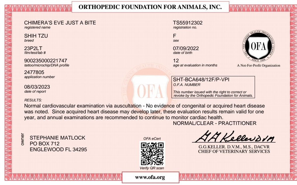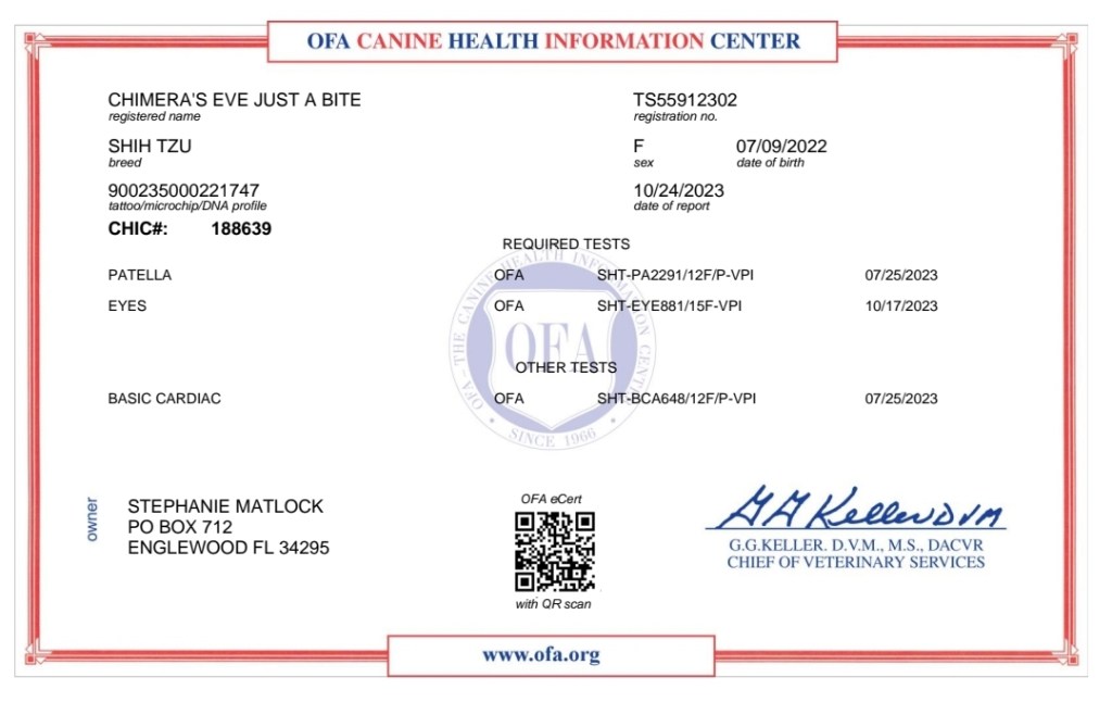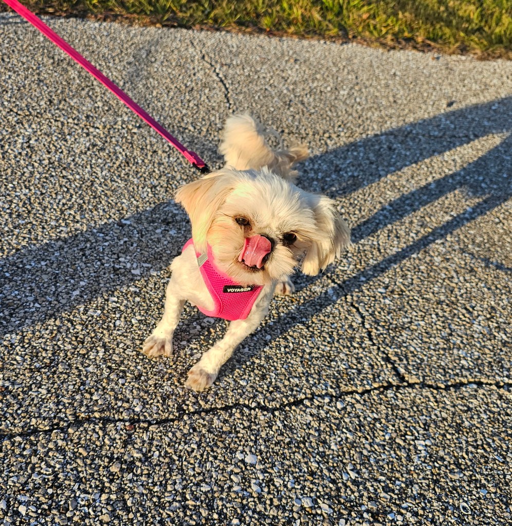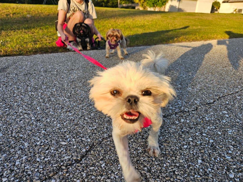 Eve is a petite, dainty little girl. Her coat is a little more cottony and more difficult to keep longer as it tangles easier. She does have other excellent attributes though. I love her jet black nose and eyes against her beautiful white cream coat. She is very healthy and agile, no signs of physical impairments at all. She can keep up with the tzu gang, running at top speeds and leaping as they go. She has a lot of fun with her dog friends.