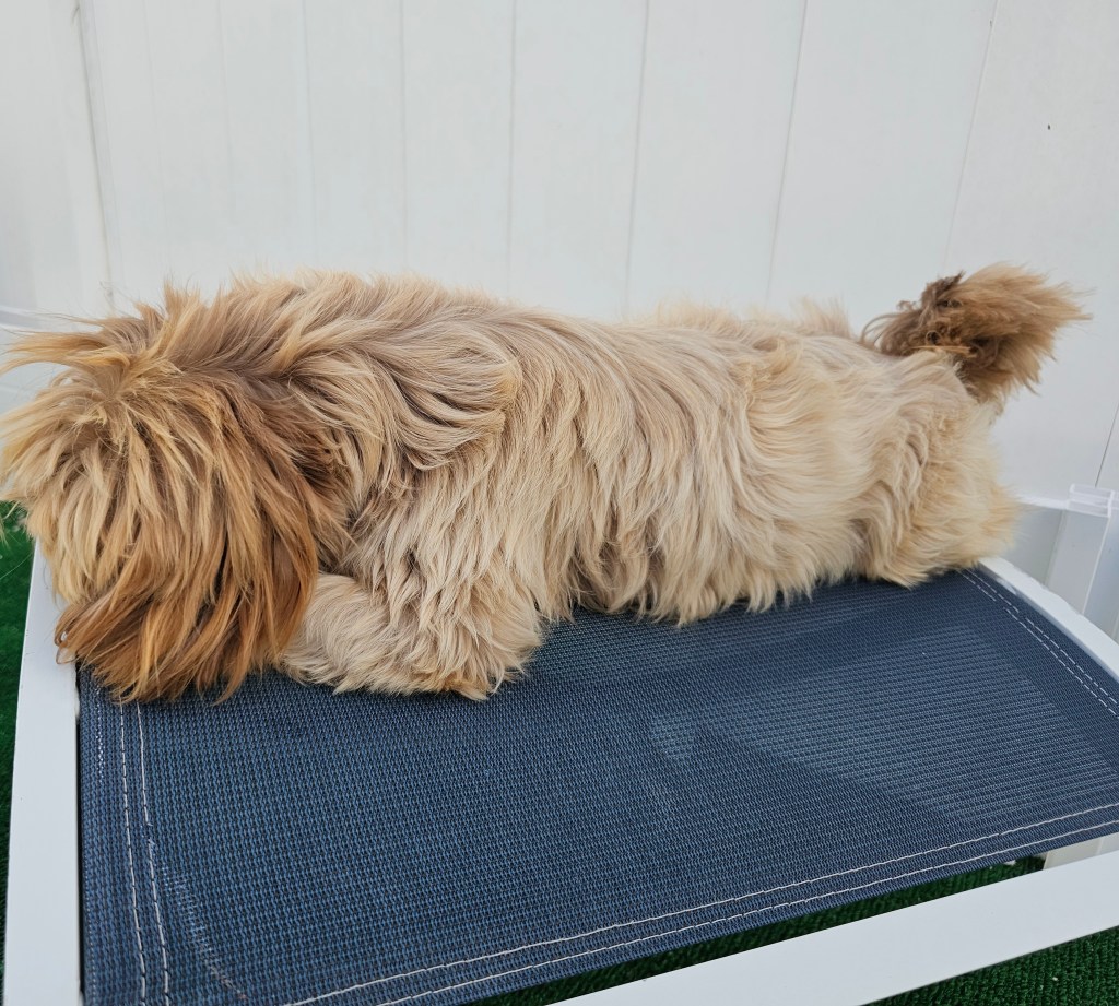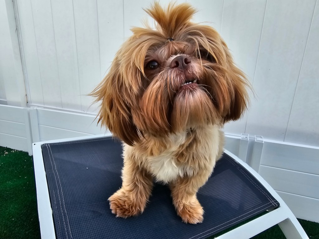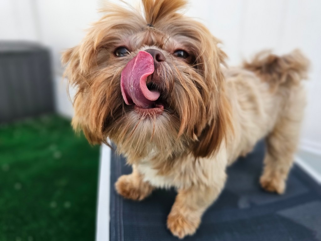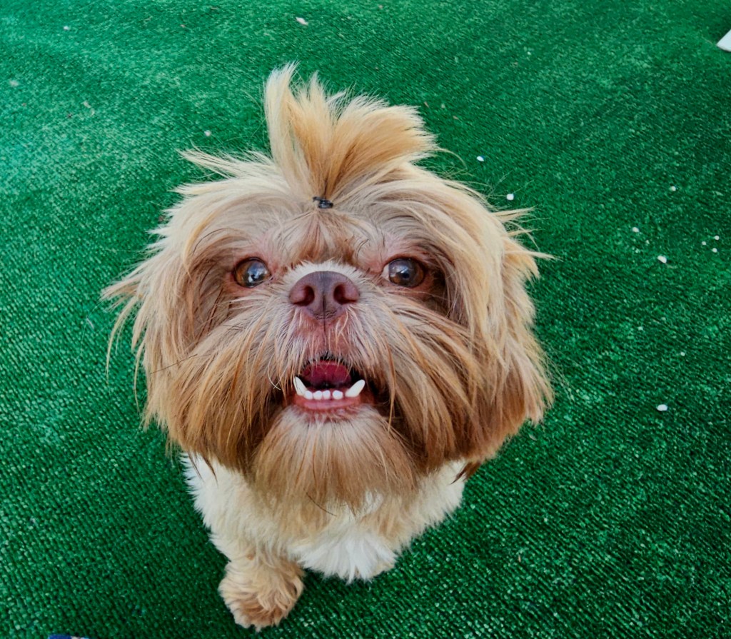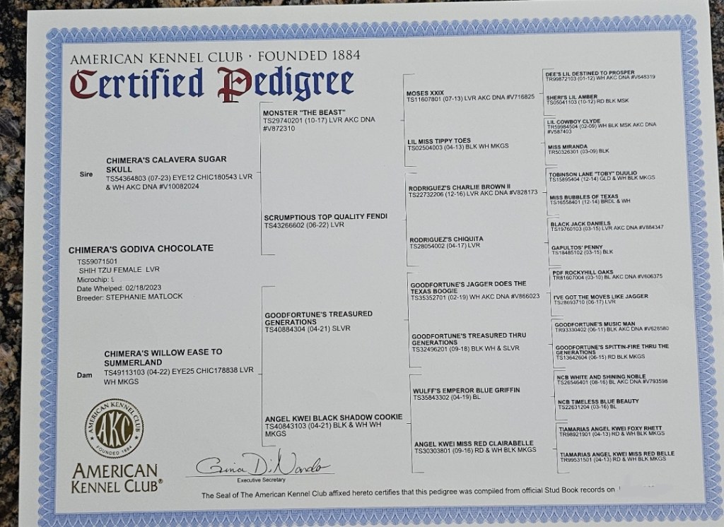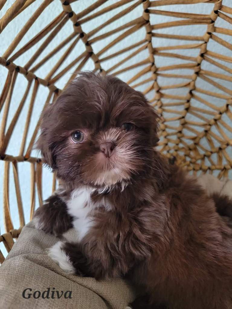 Godiva is not the smallest girl. She has a bit more to her girth and substance that some of our petite girls. She’s got a nice, solid Shih Tzu frame as fits the AKC Breed Standard. She has a really thick, beautiful coat of hair. Her chocolate nose is absolutely kissable & her chocolate brownie eyes make me melt.