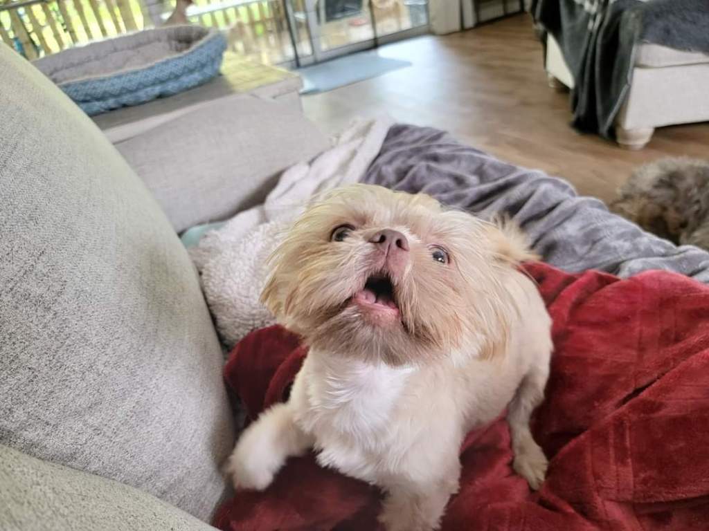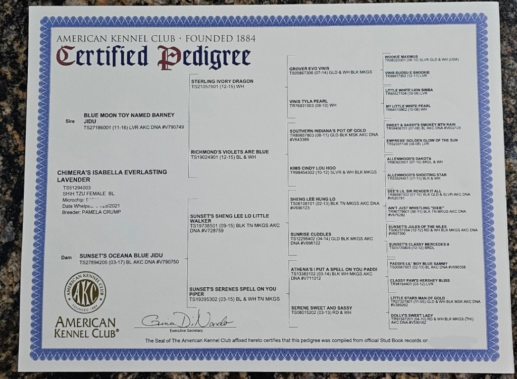 Isabella, oh my heart! Isabella is a tiny AKC Registered lavender brindle Shih Tzu. She is absolutely precious and adorable in every way. She has a tender innocence about her. She is a silly little clown.