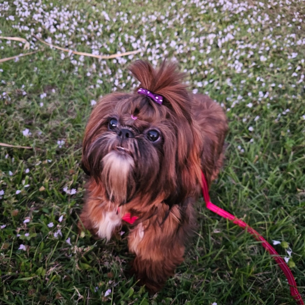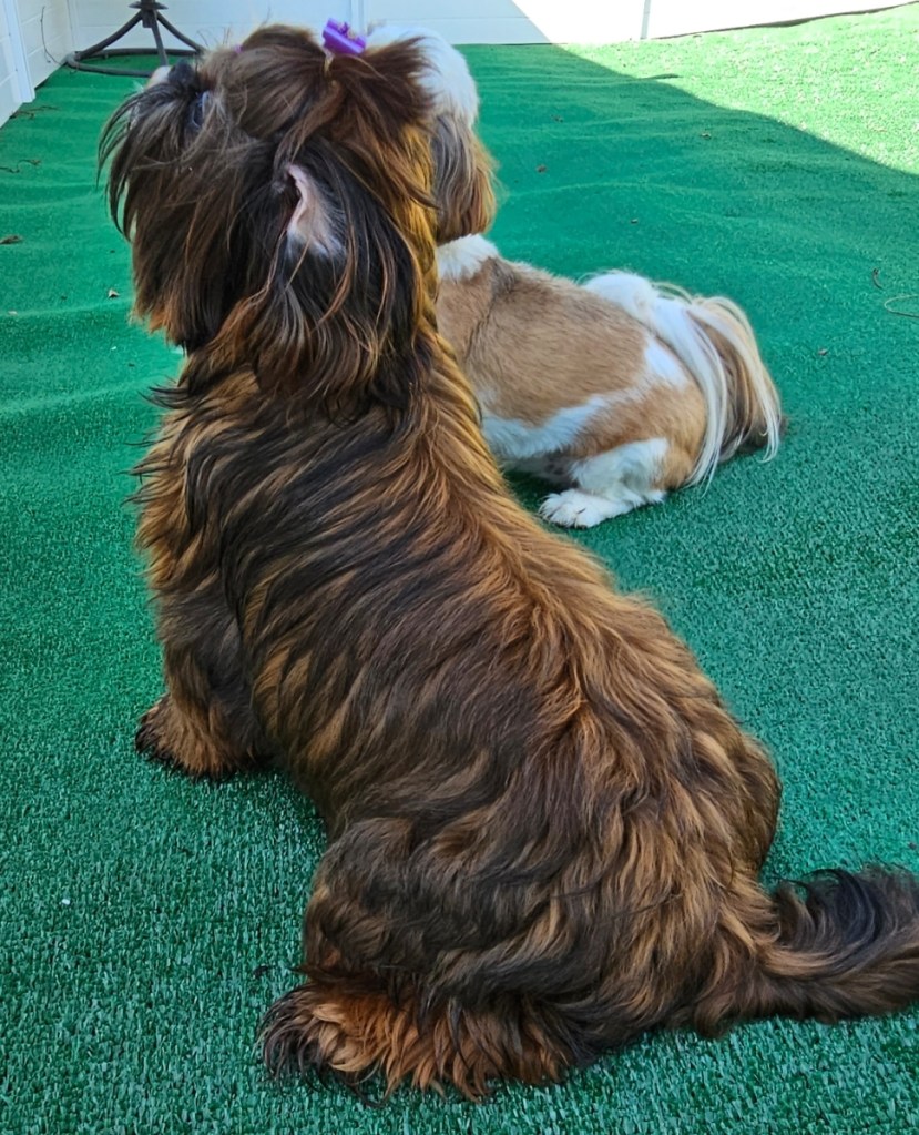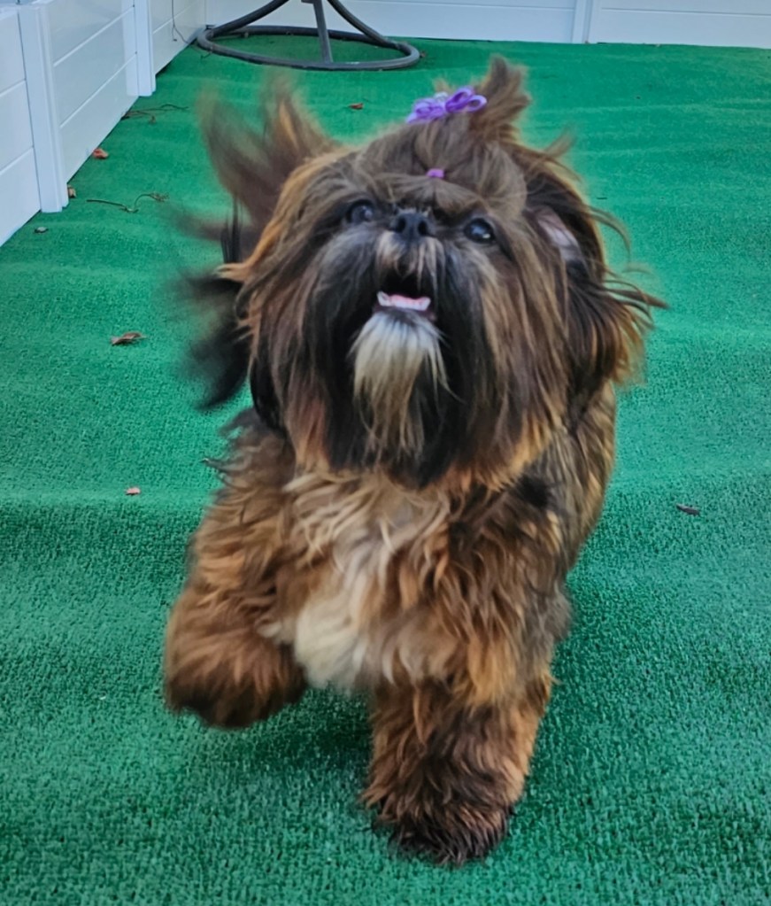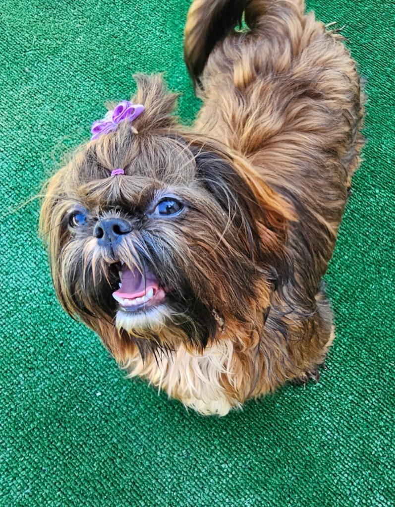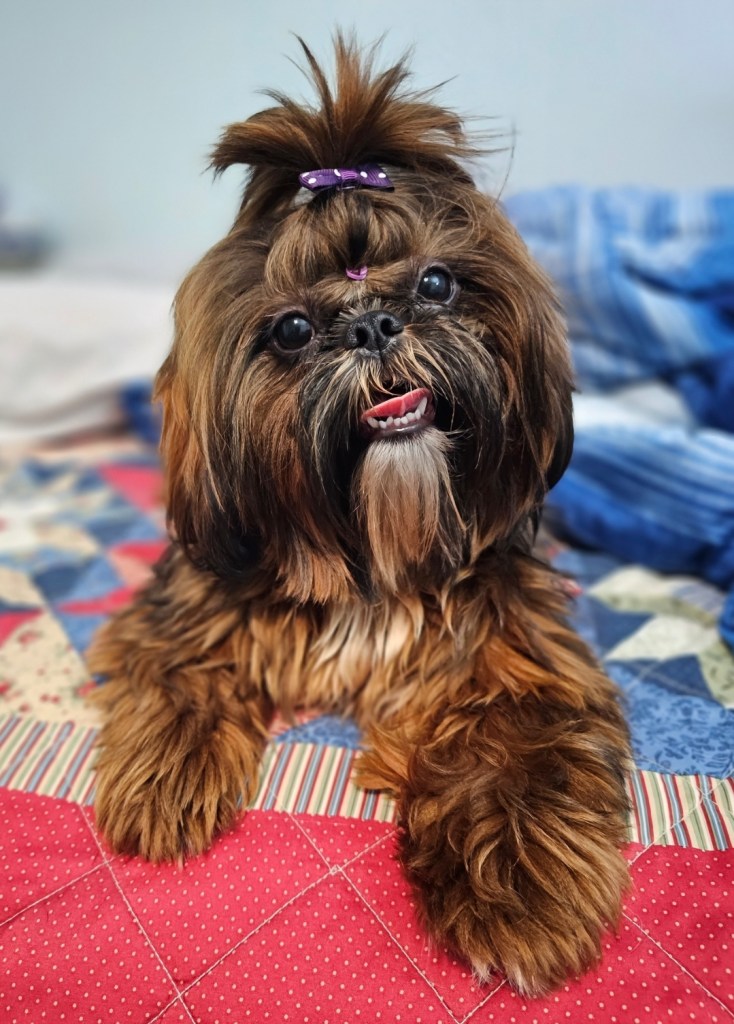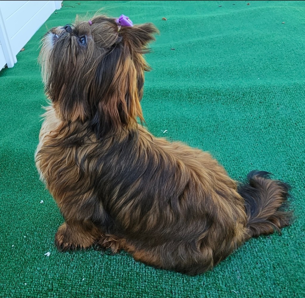 Khaos is a standard sized Shih Tzu. She’s perfectly sized for the show ring with an equally prized full coat. Her hair is thick and plentiful. It is such a gorgeous, rich color, and grows fast enough you can play around with all different grooming styles.