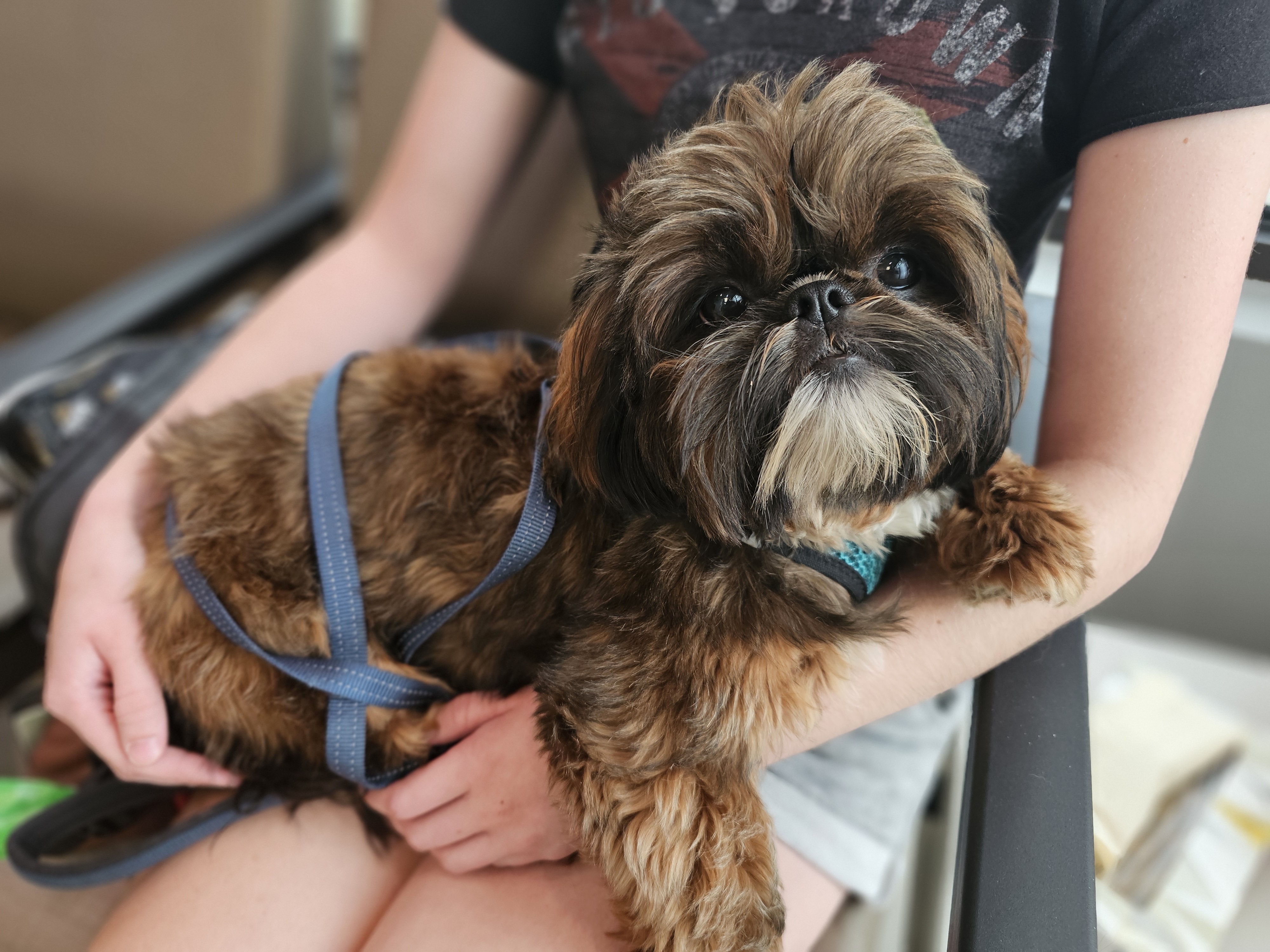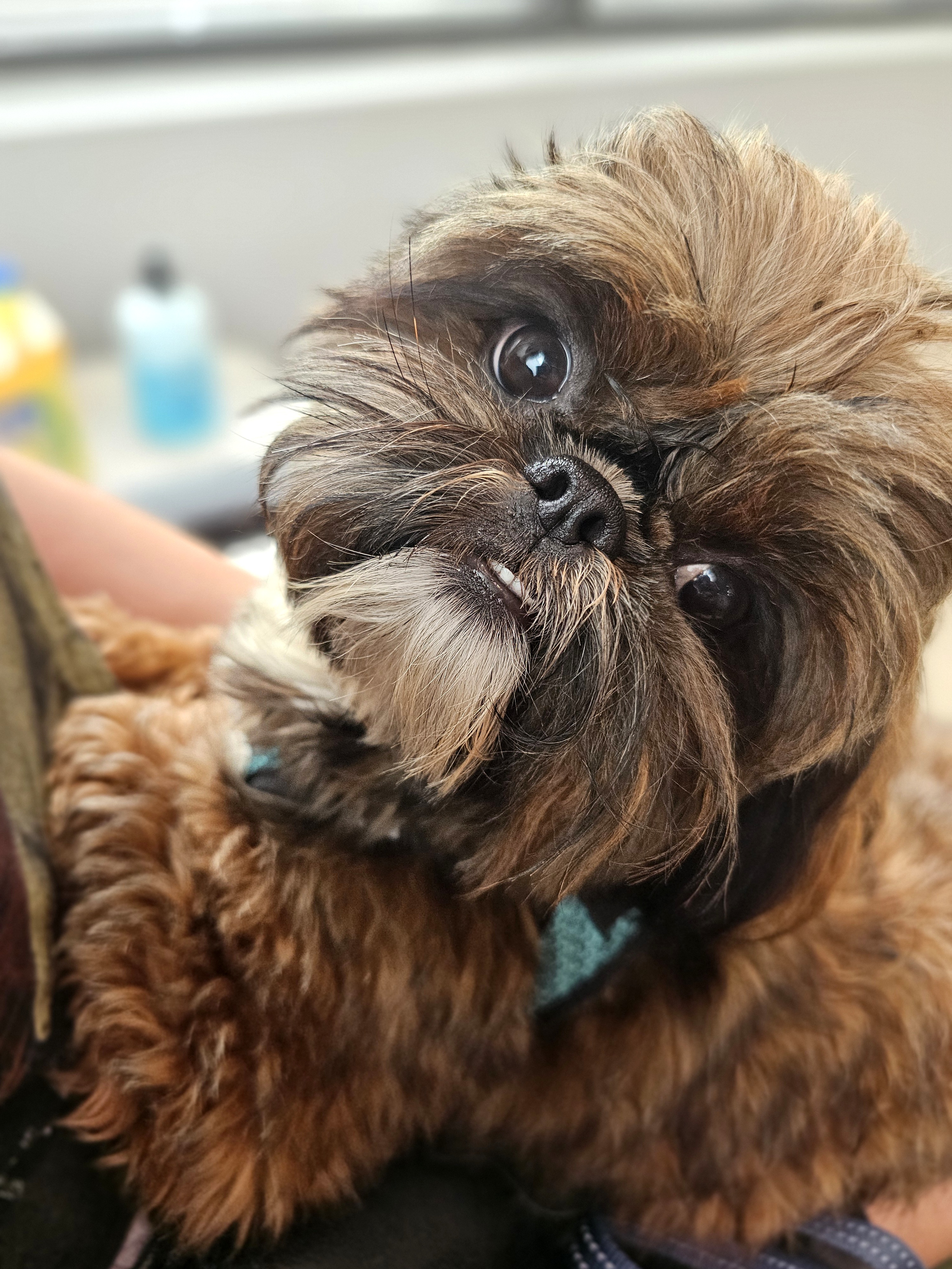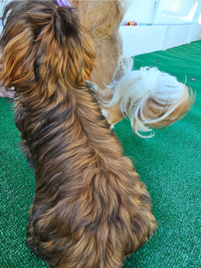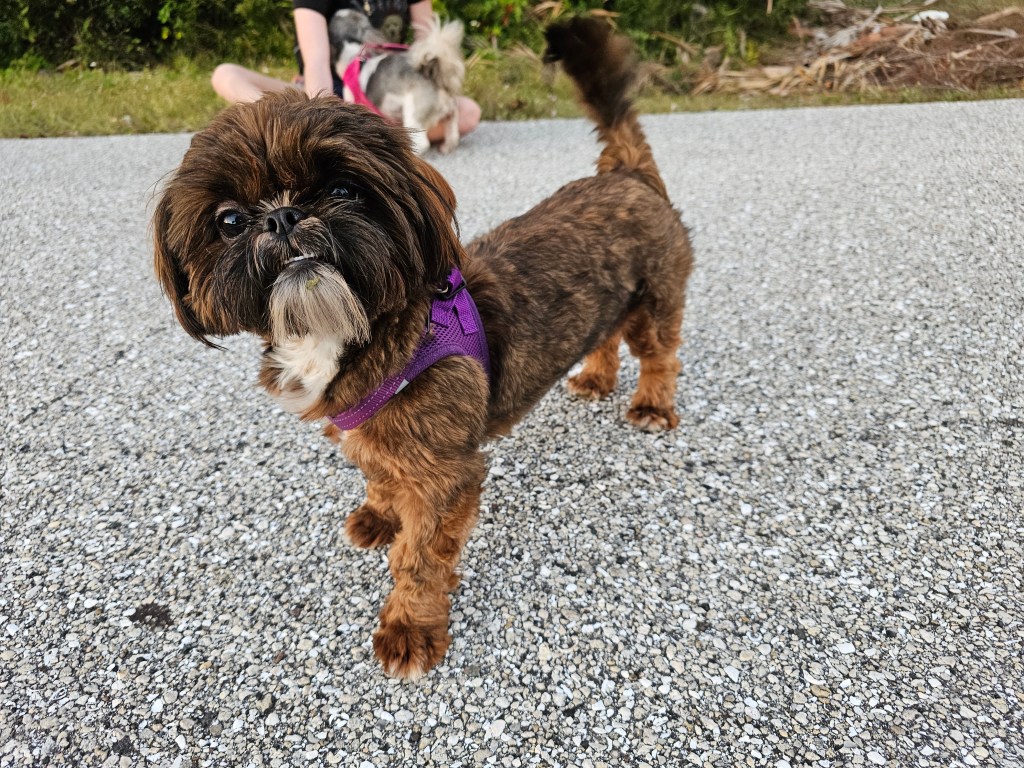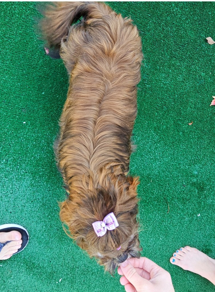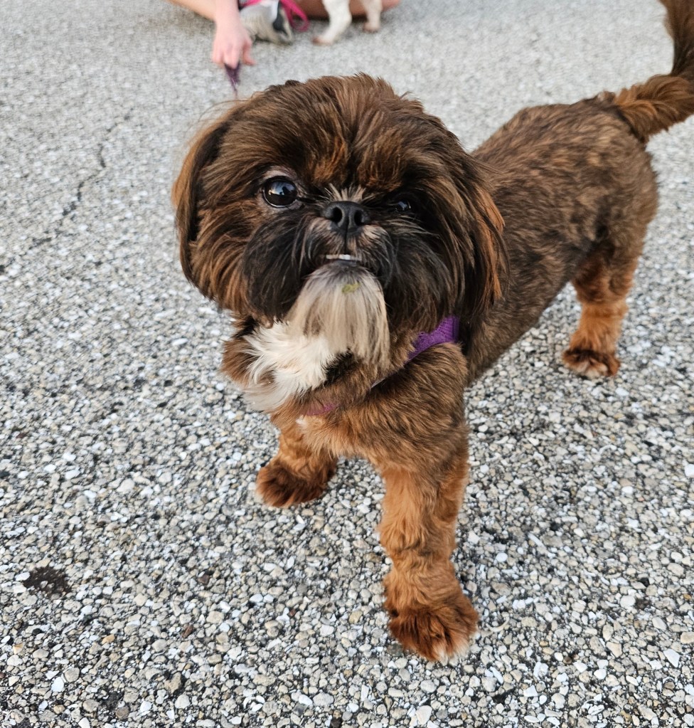 Khaos is a standard sized Shih Tzu. She’s perfectly sized for the show ring with an equally prized full coat. Her hair is thick and plentiful. It is such a gorgeous, rich color, and grows fast enough you can play around with all different grooming styles.