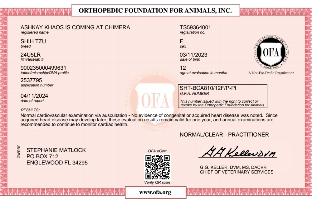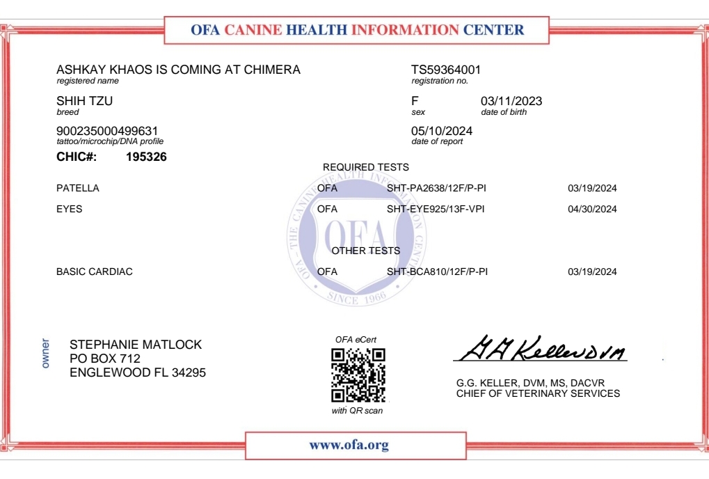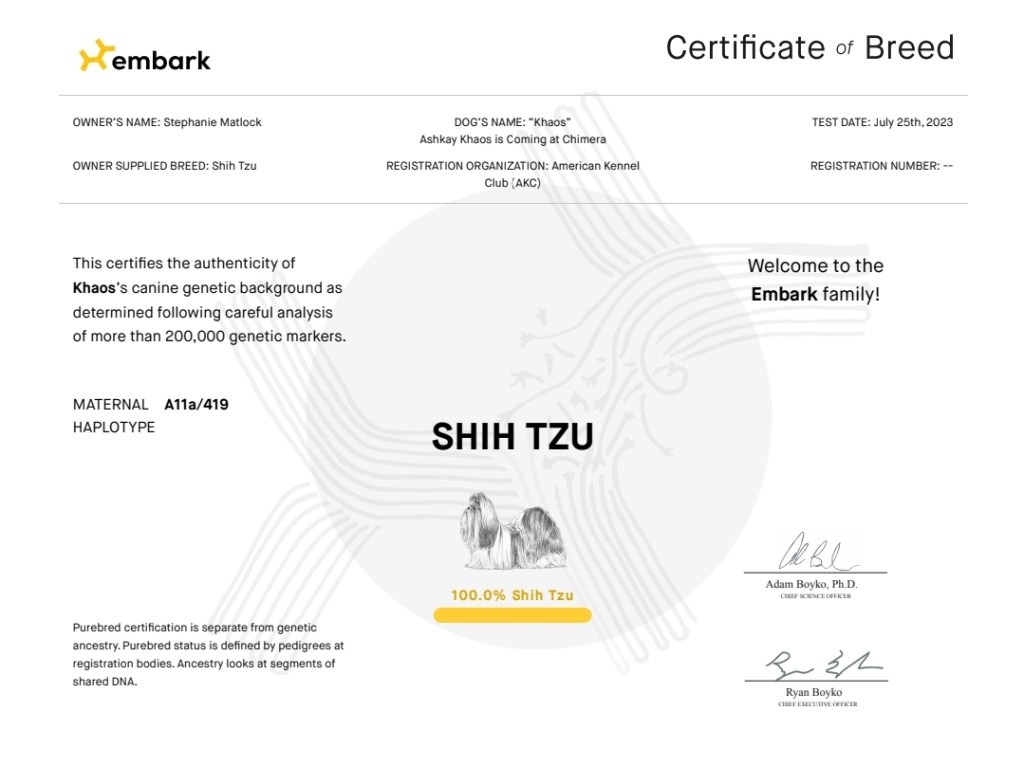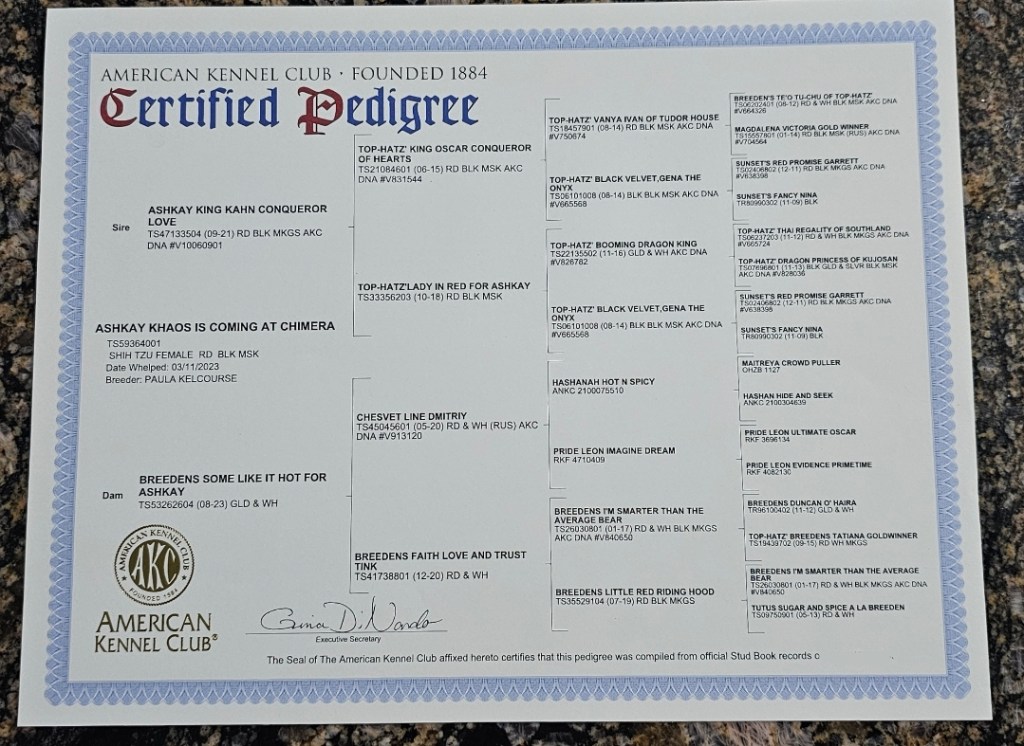 Khaos is a stunning dark red girl. She hails from multiple generations of international champions. The paternal side of her pedigree is filled with Top Hatz dogs, from Kitty Kyrkland who imported several gorgeous dogs from Russia years ago. The maternal side of her pedigree hosts several champions. Khaos’ heritage hails from Austria, Australia, Russia, and some American dogs. We are so fortunate and grateful to be trusted with special Shih Tzu lines. We do not take this responsibility lightly and plan to use all available resources provide Khaos the best possible pairings to bring such quality bred puppies to future generations of dog lovers. There is something special about a really well bred dog with such a rich history.