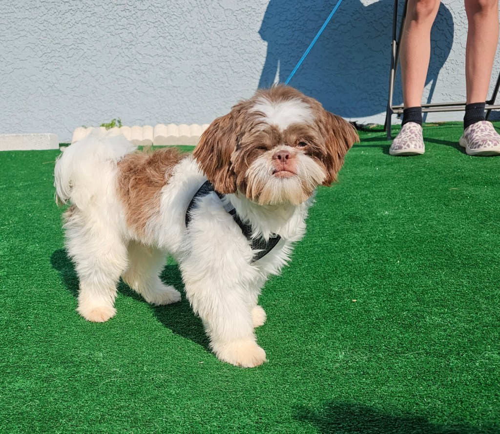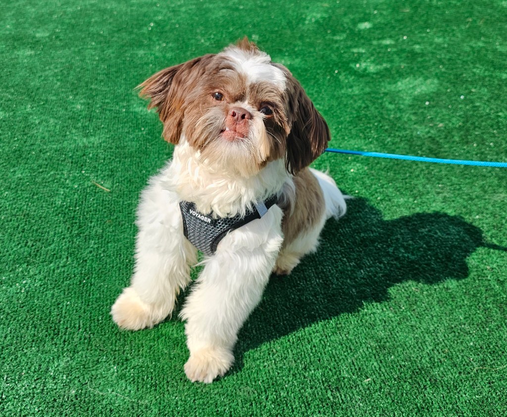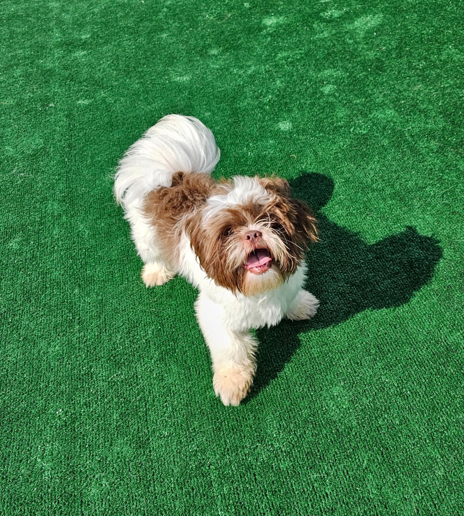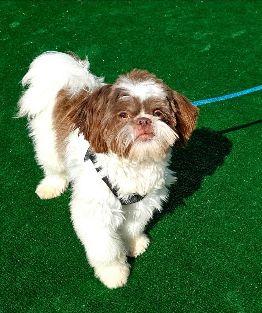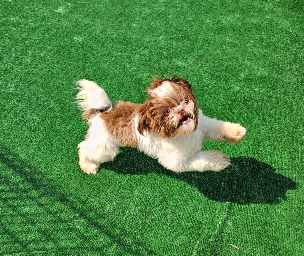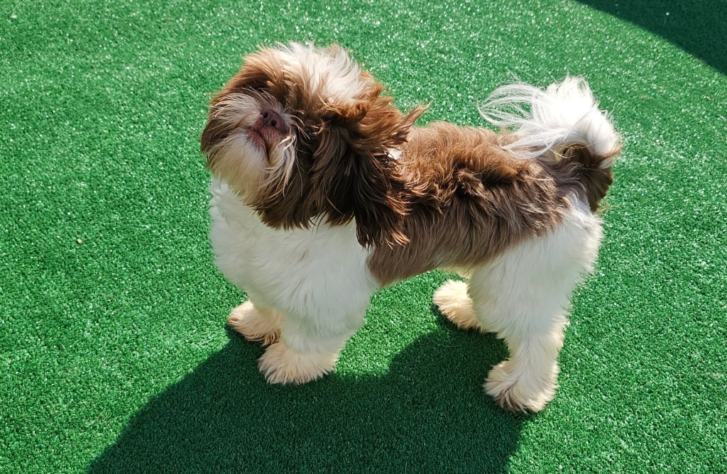 Maui is a great little guy. He’s lean and petite built. He does have slightly longer legs making him a little taller, although he is not “bigger” in weight. He is right at the low end of the AKC Breed Standard size of 9 – 16 lbs. He has great breed features. A nice coat, great eyes, sweet expression, gentle nature, outgoing temperament, nice open nostrils, no breathing issues, he’s athletic and healthy. He brings a lot of life to the party here at Chimera Shih Tzu!