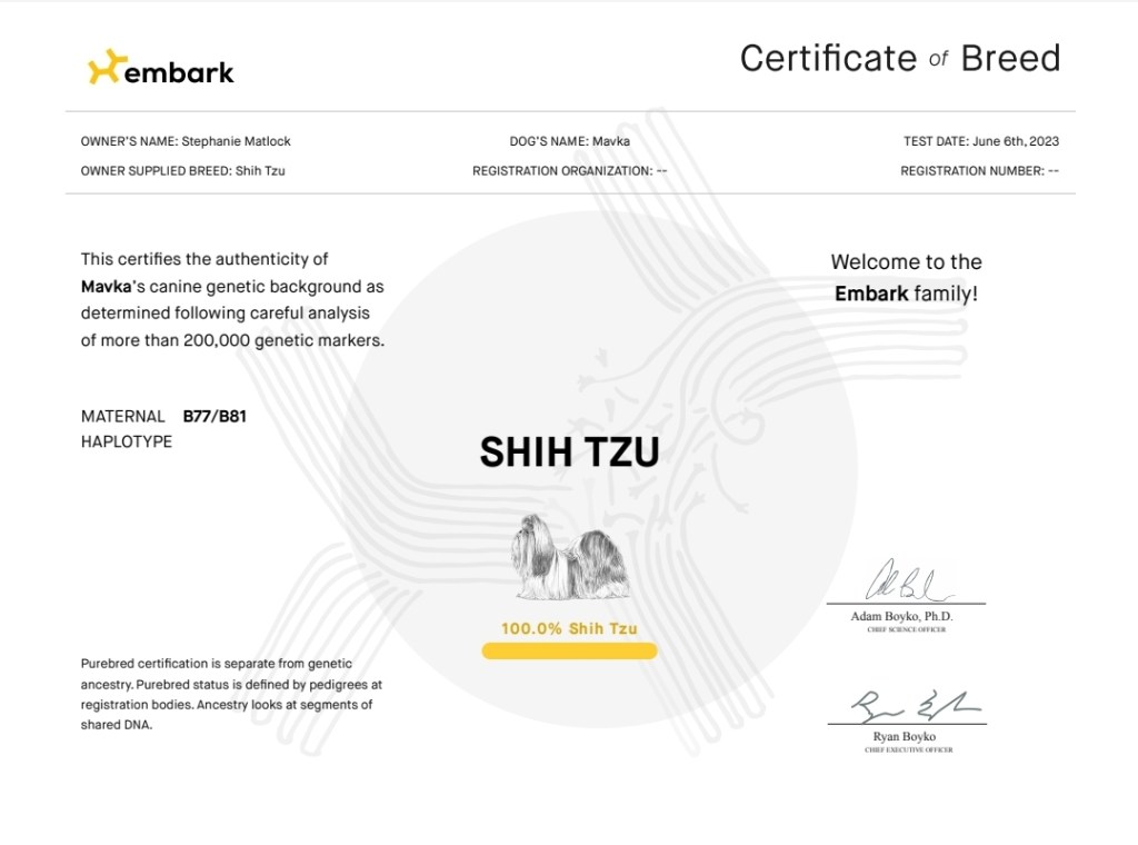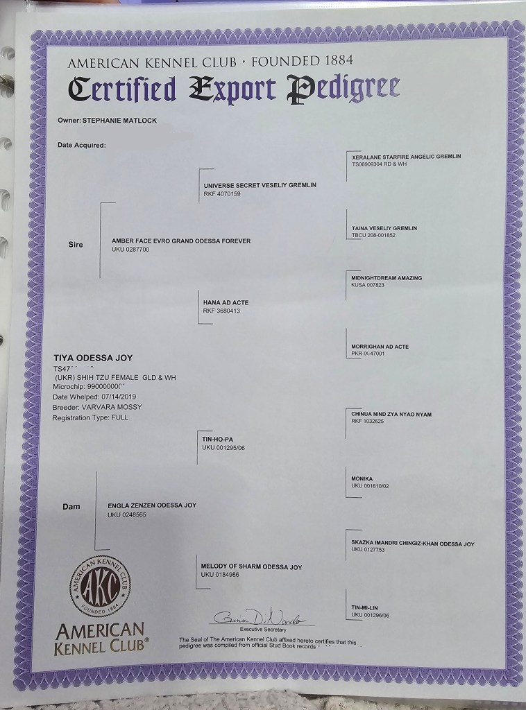 Mavka’s pedigree of parents, grand parents, and great grandparents includes generations of champions and grand champions from Ukraine, Russia, Belarus, South Africa, and Poland.