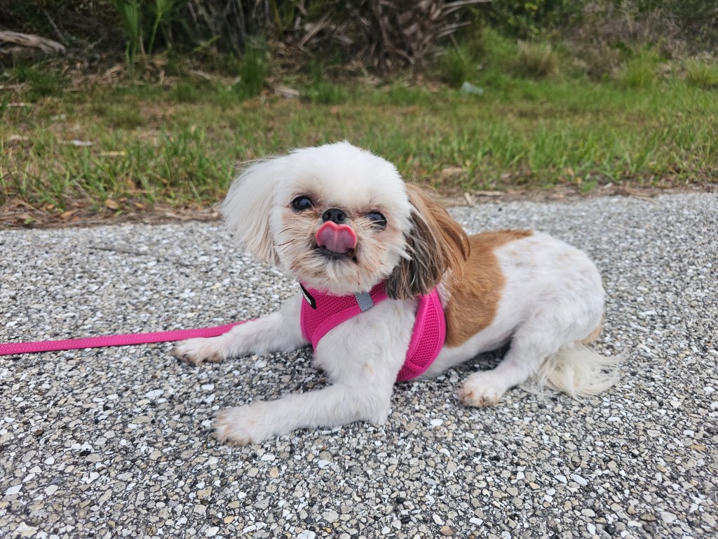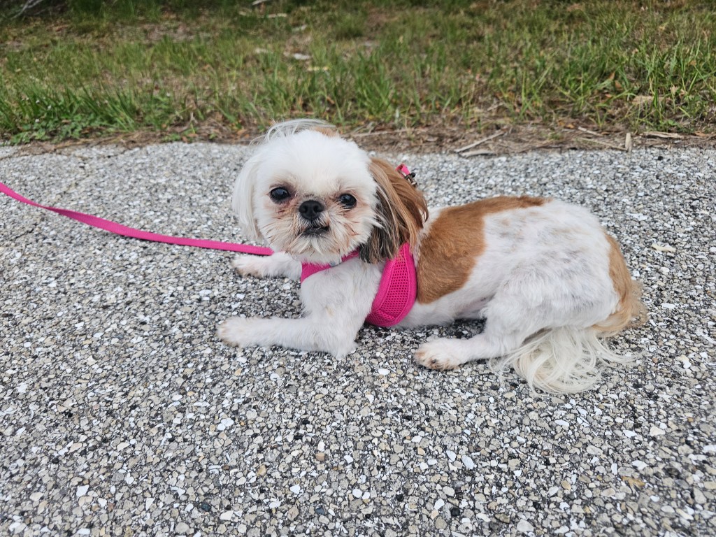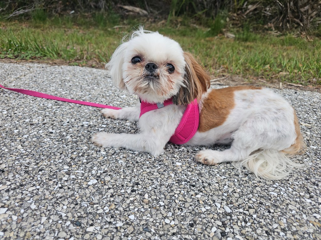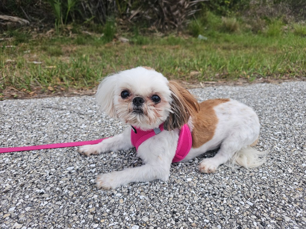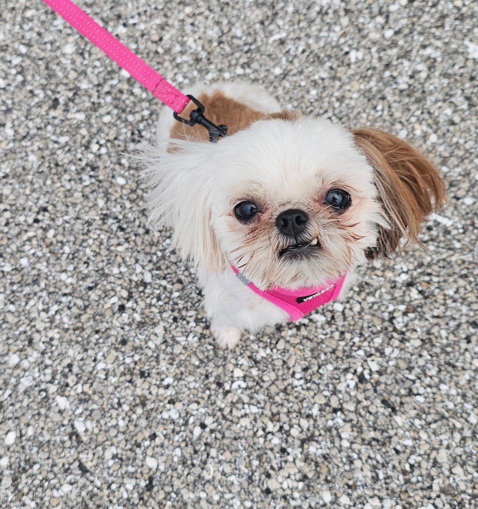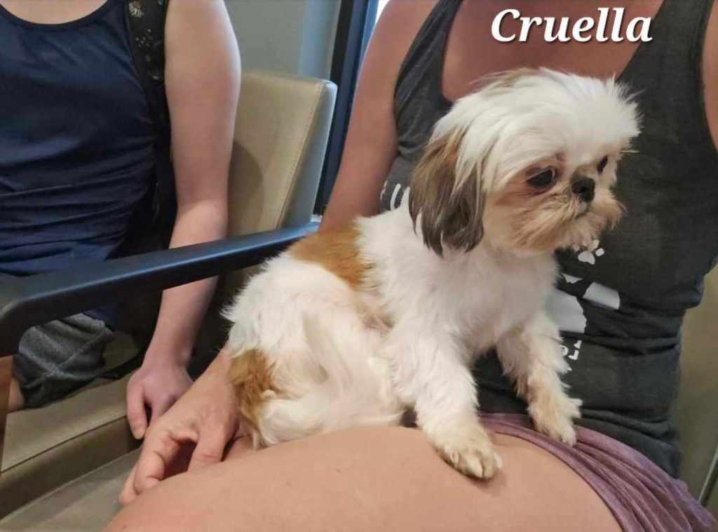 Cruella is a sweet, petite Shih Tzu with a very gentle nature. She is dainty and delicate. She is mostly white with some bright reddish orange spots.