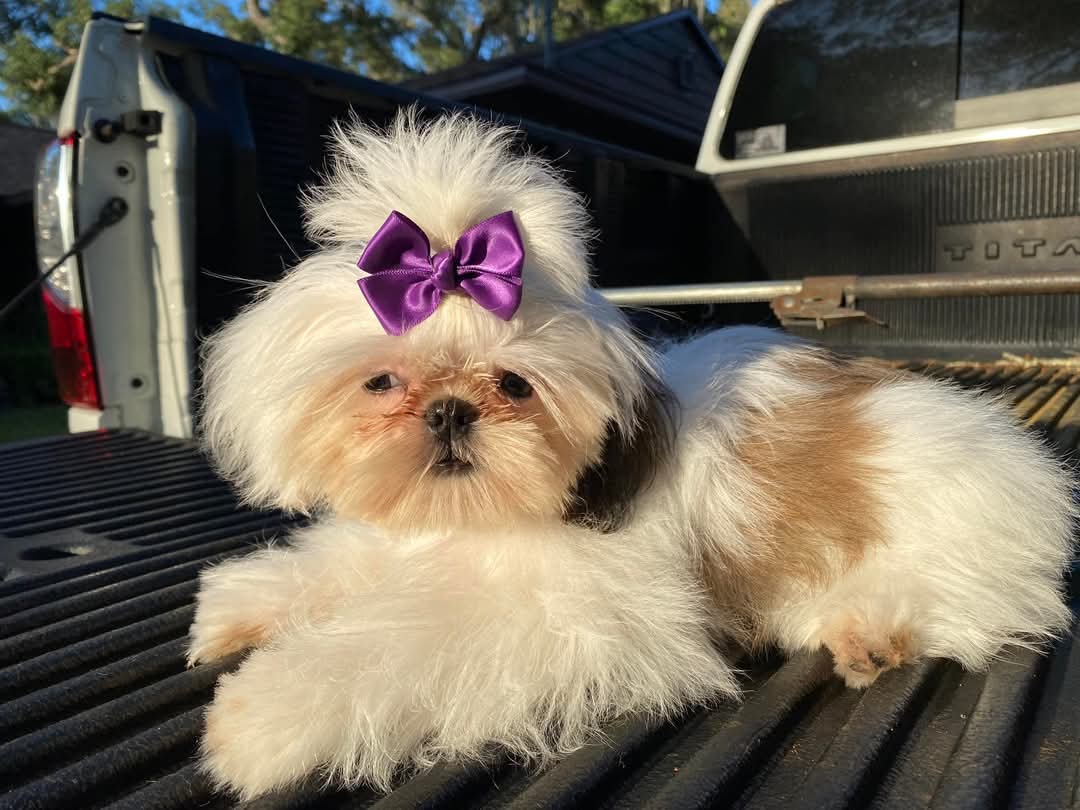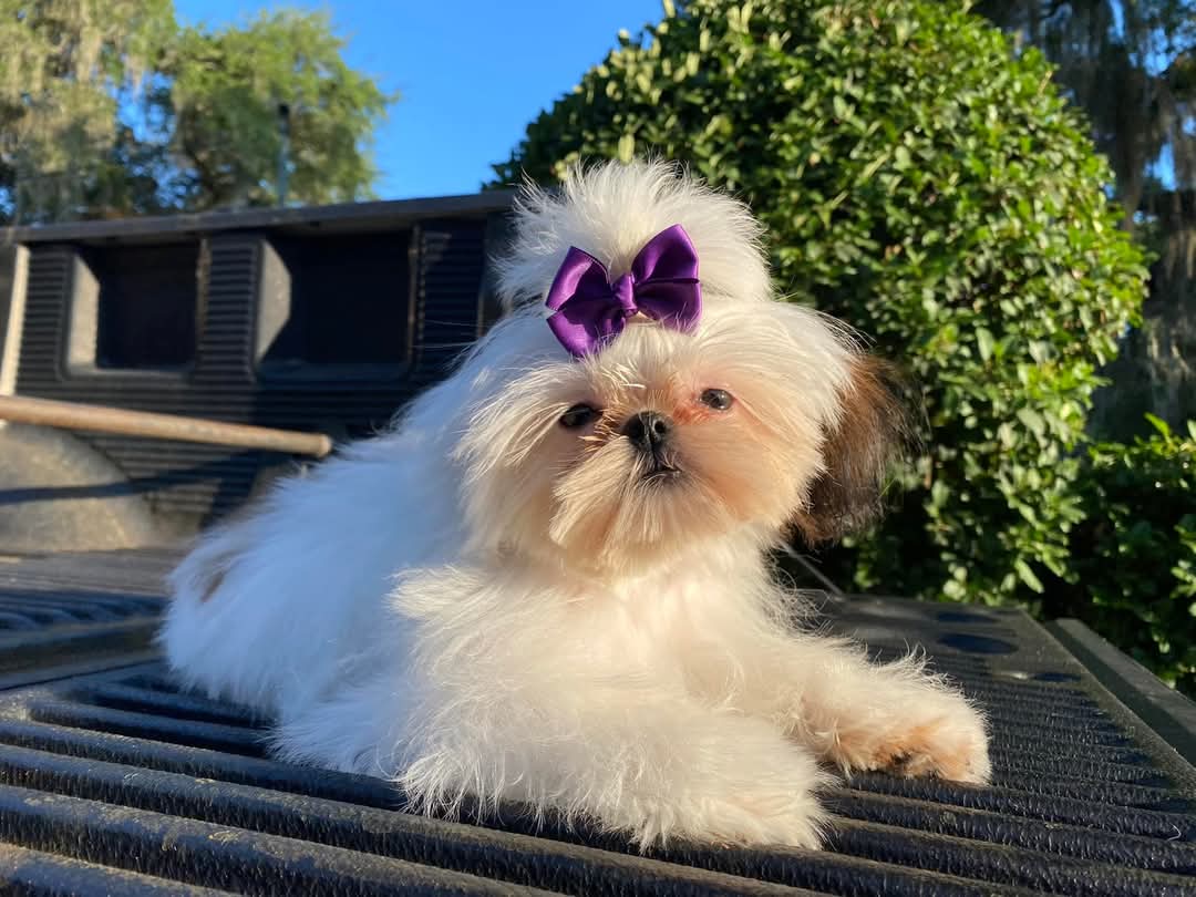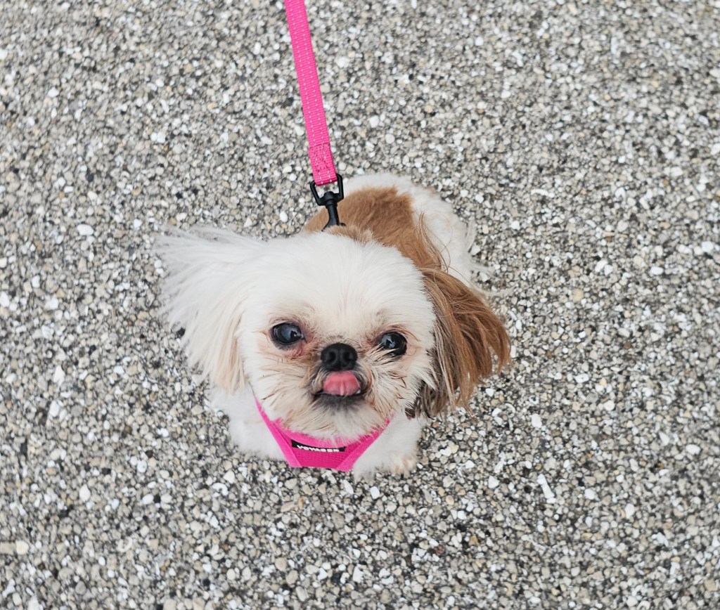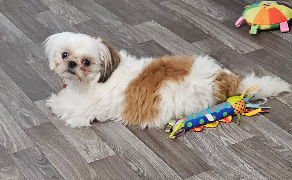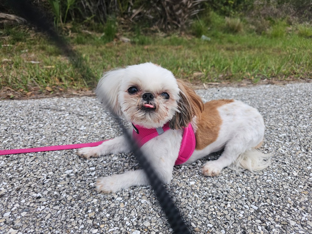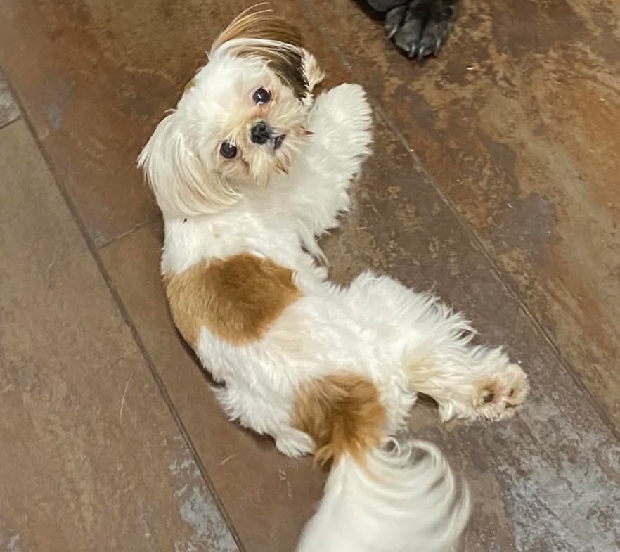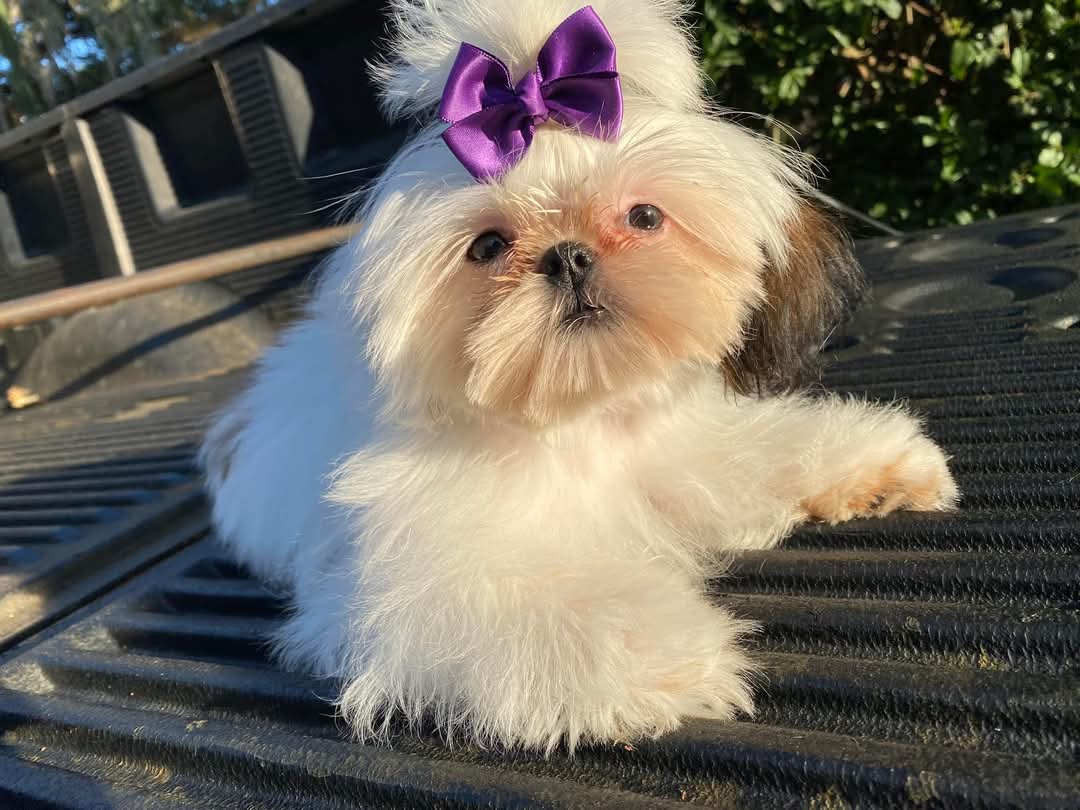 Cruella is a sweet, petite Shih Tzu with a very gentle nature. She is dainty and delicate. She is mostly white with some bright reddish orange spots.