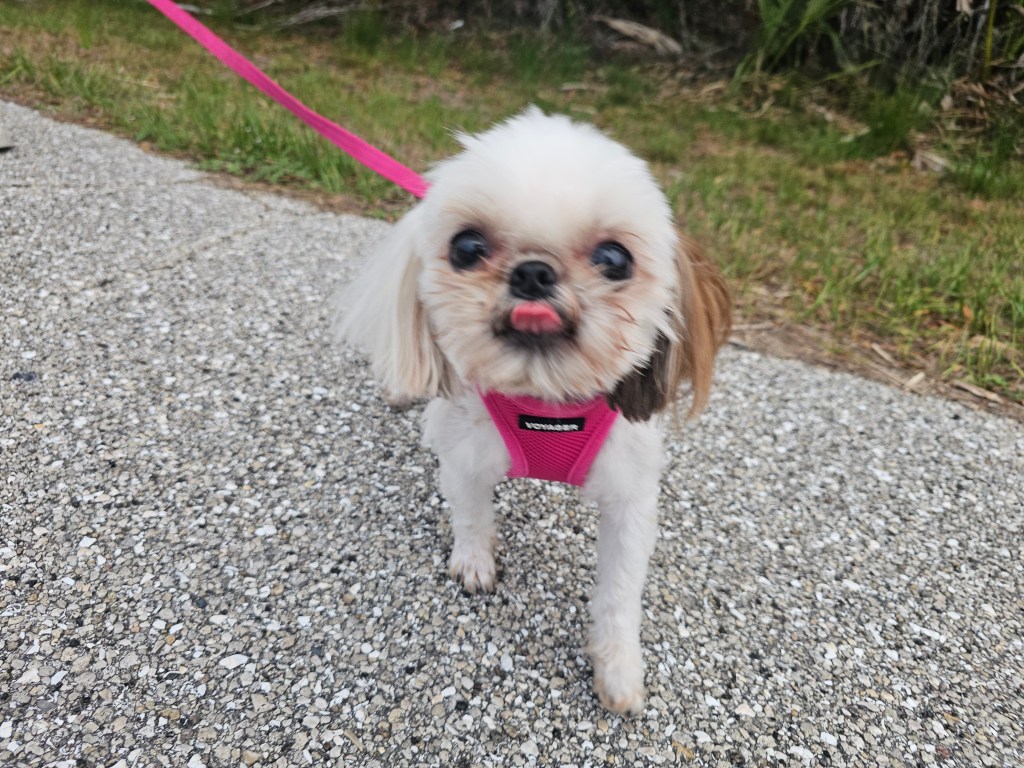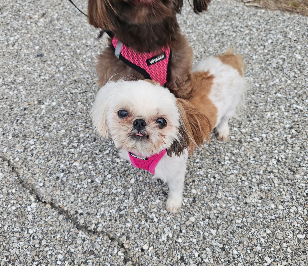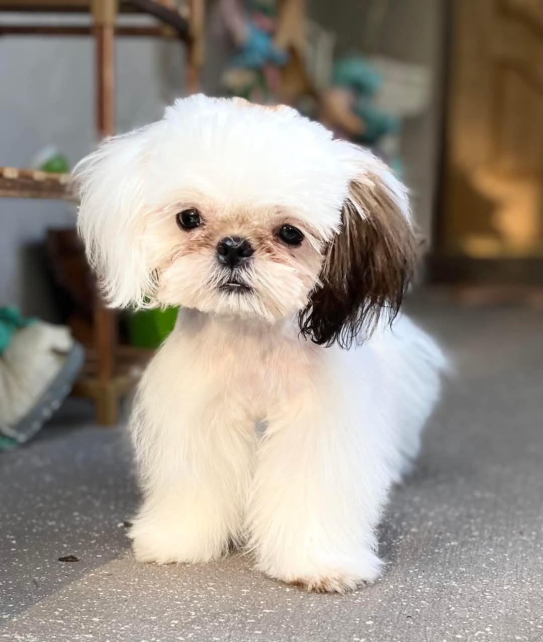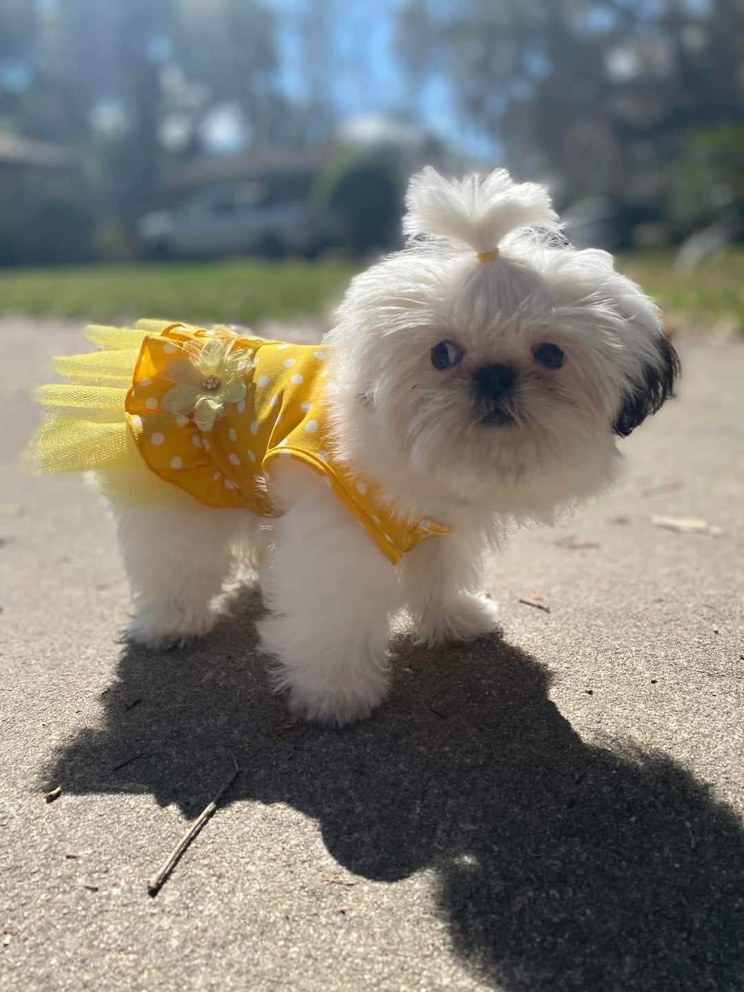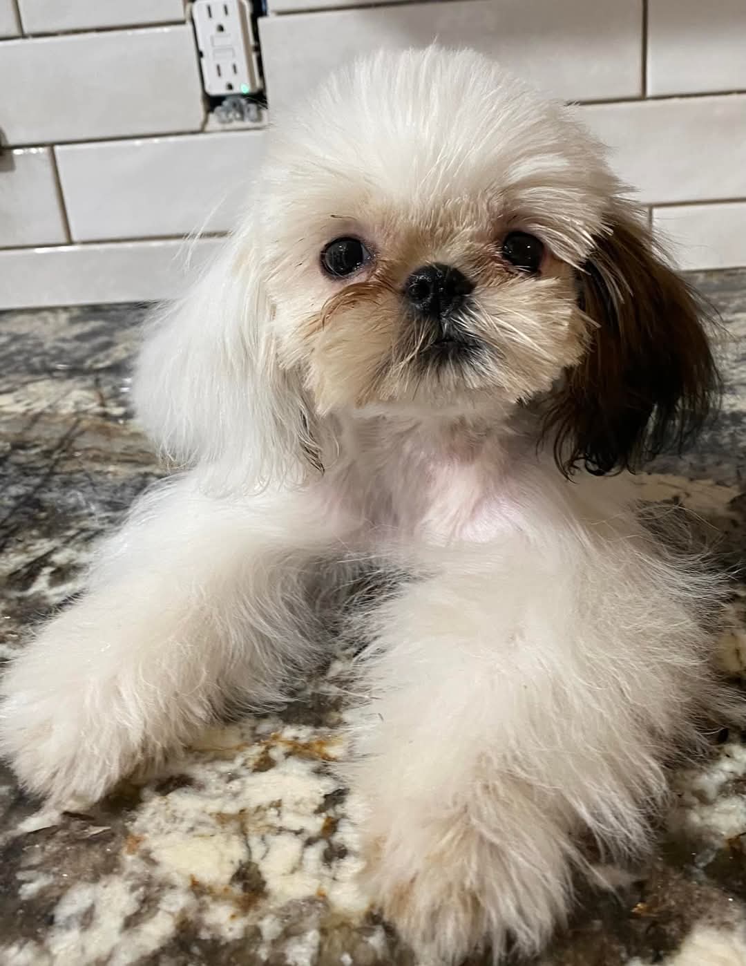 Cruella is a sweet, petite Shih Tzu with a very gentle nature. She is dainty and delicate. She is mostly white with some bright reddish orange spots.
