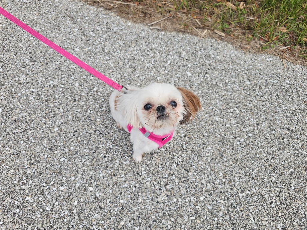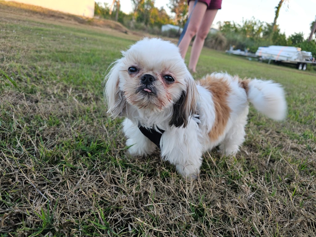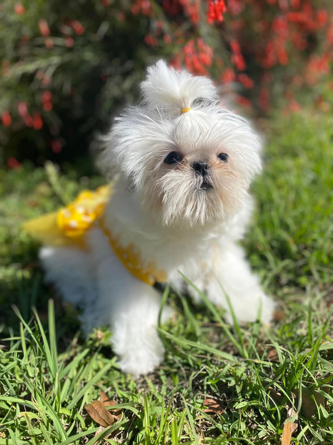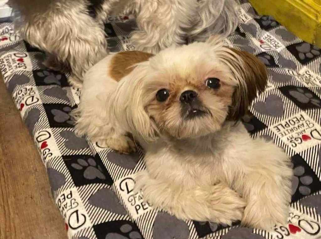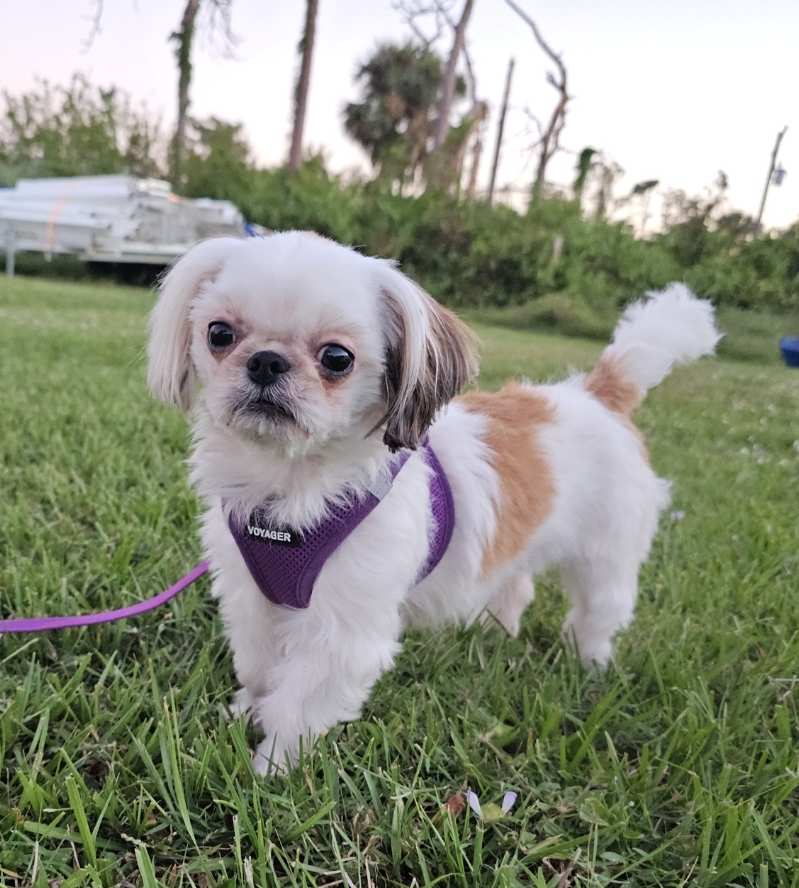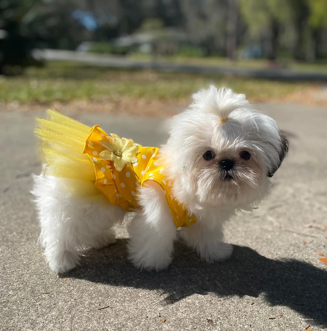 Cruella is a sweet, petite Shih Tzu with a very gentle nature. She is dainty and delicate. She is mostly white with some bright reddish orange spots.