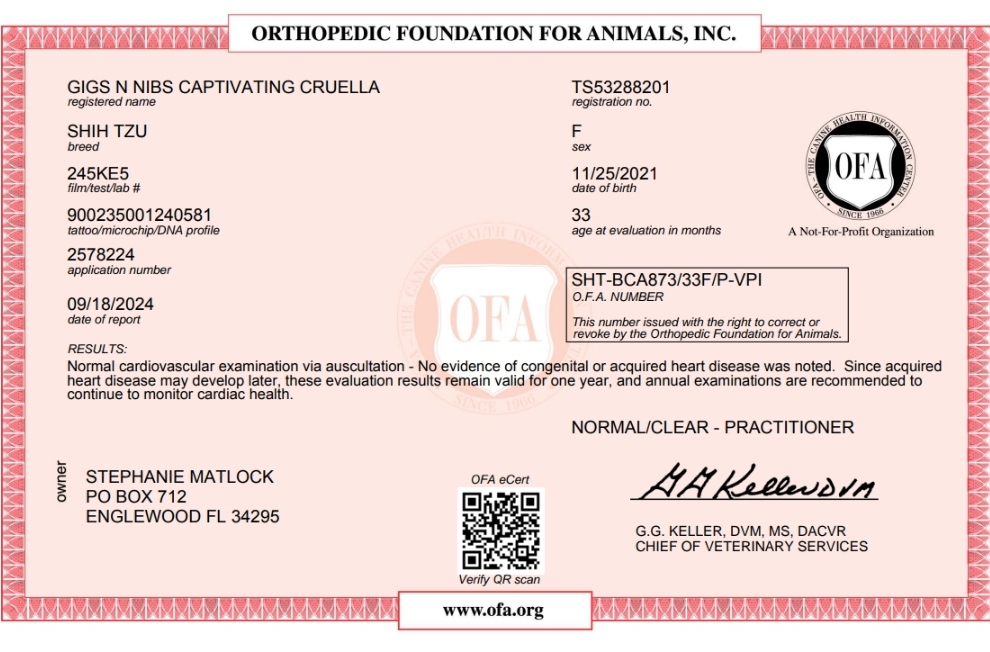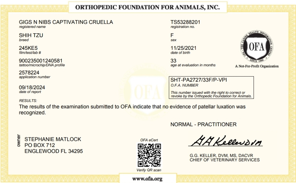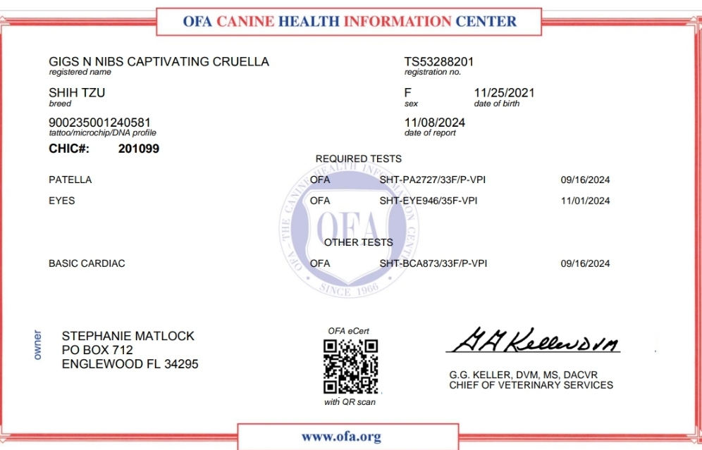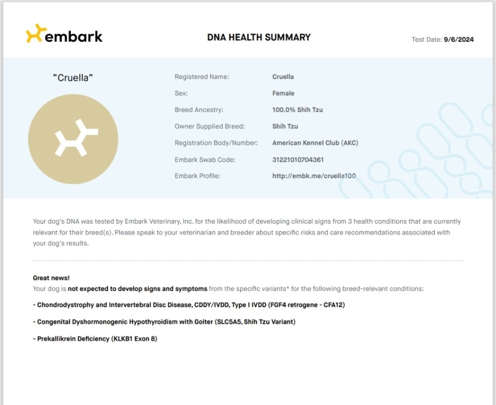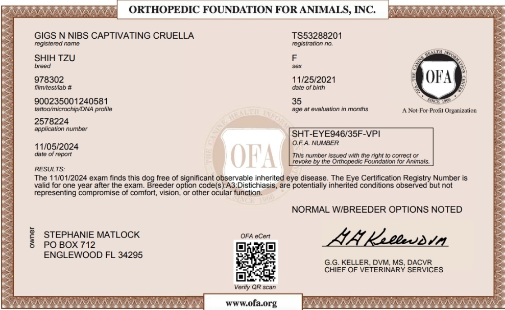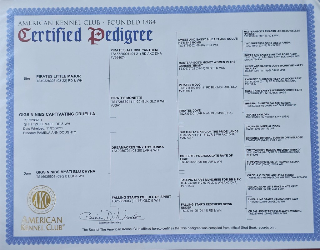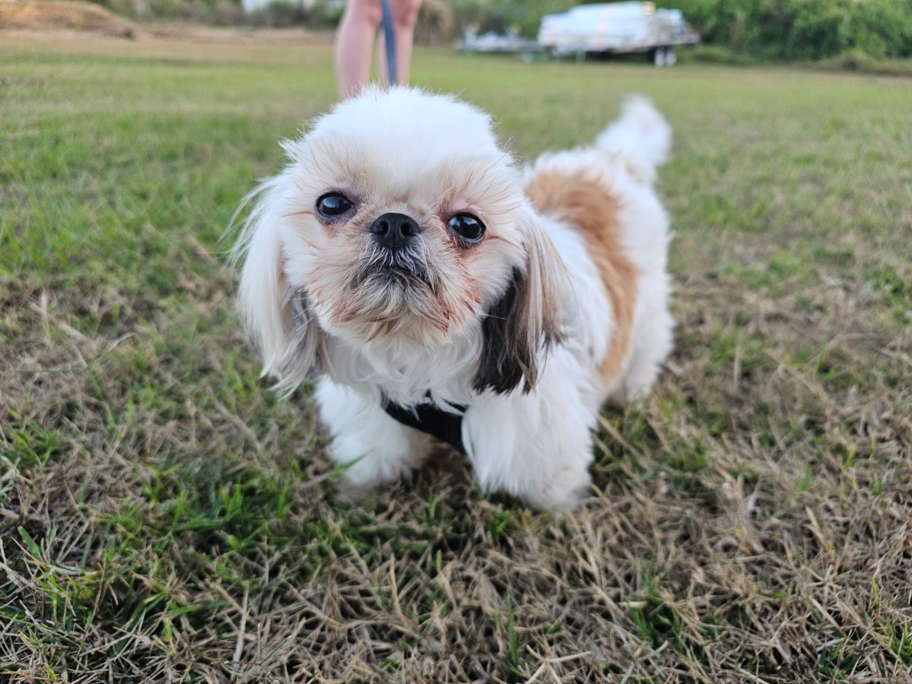 Cruella is a sweet, petite Shih Tzu with a very gentle nature. She is dainty and delicate. She is mostly white with some bright reddish orange spots.