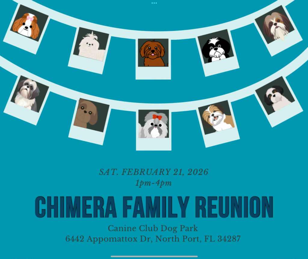 Come join us for an afternoon of Shih Tzu fun as we takeover the Canine Club Dog Park! This facility is fully fenced inallowing your dog to be off leash and for you to fully enjoythe family reunion. We have reserved the park exclusively to our reunion for the afternoon. We encourage all current, past, and future Chimera family members to come say hi!!