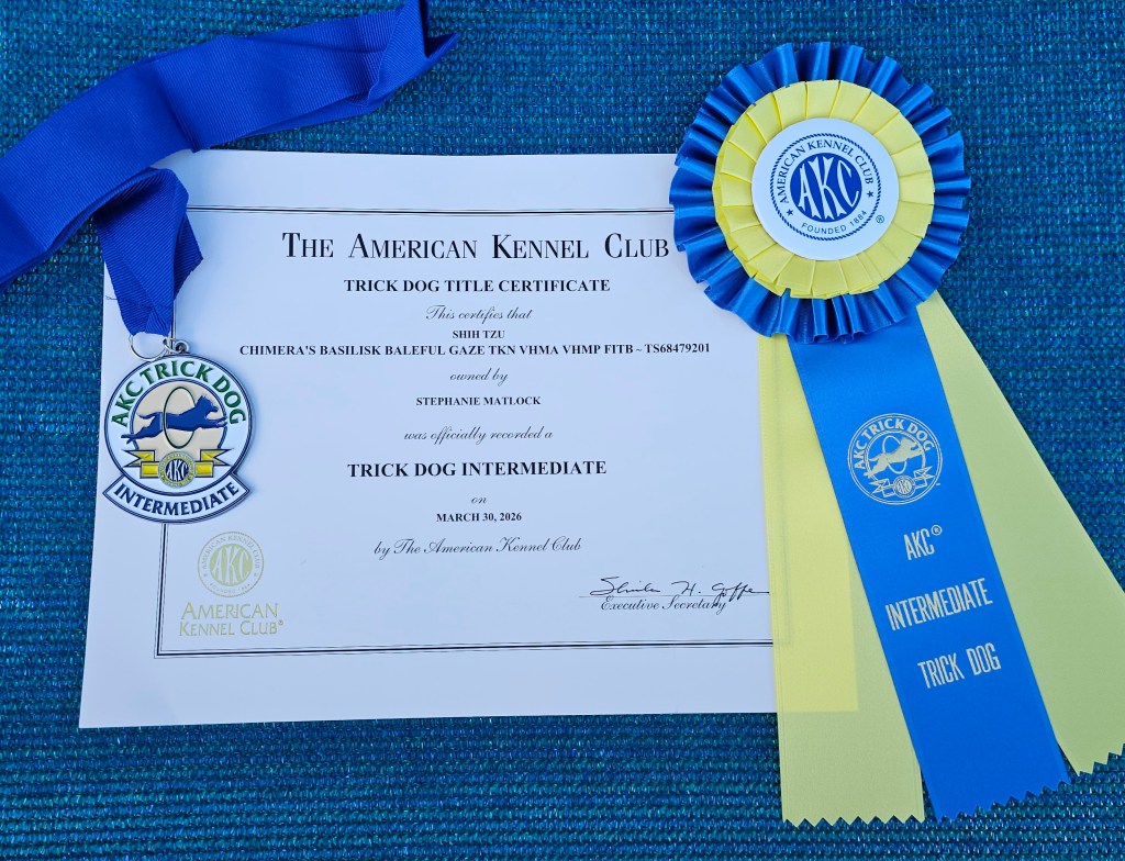 - AKC Intermediate Trick Dog (TKI) – Your dog must have the Novice title, plus perform 10 Intermediate tricks. See the list of tricks here.