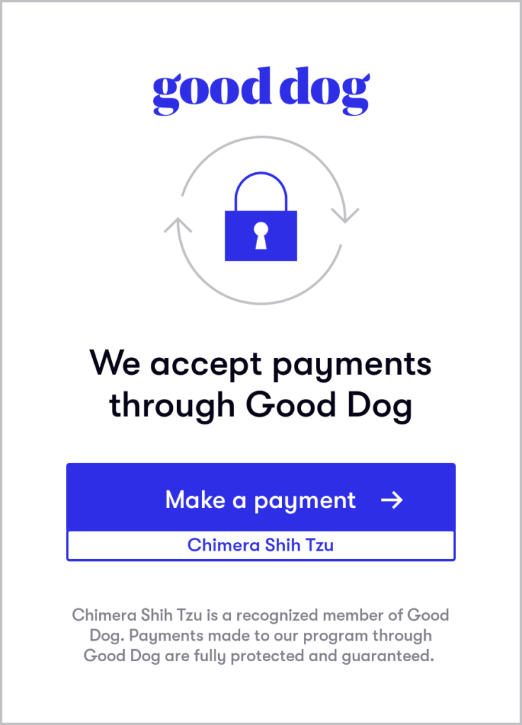 Good Dog offers a secure payment platform to make deposits or final payments. They do charge a service fee, but they back the transation to protect both parties. We trust Good Dog to protect us against fraud.