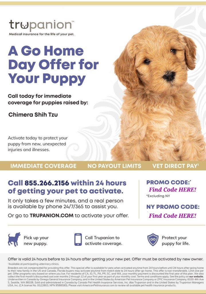 Trupanion offers our puppy families 30 days of pet insurance that covers new unexpected injuries and illnesses. Activate within 24 hours of bringing your puppy home using code provided in folder. Contact Trupanion for details trupanion.com